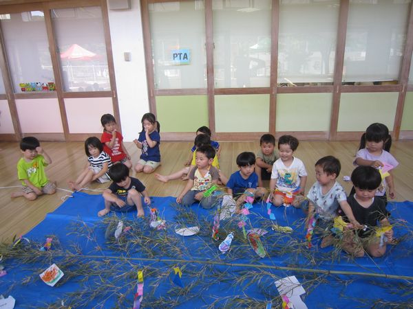 ☆幼稚園に飾る大きな笹に、みんなが作った七夕飾りを付けました!