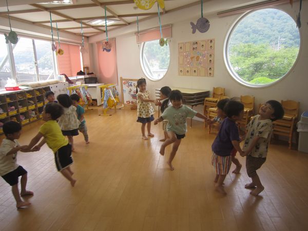 先生たちからお楽しみプレゼントは、「ぐるぐるとんねる」でした。不思議なトンネル抜けるといろんな乗り物に大変身!!とっても面白かったね♪