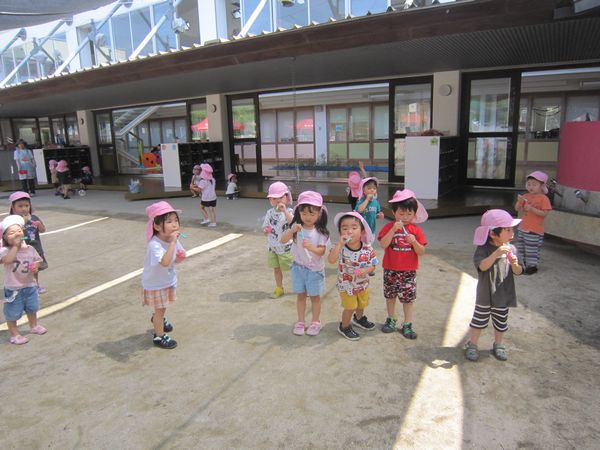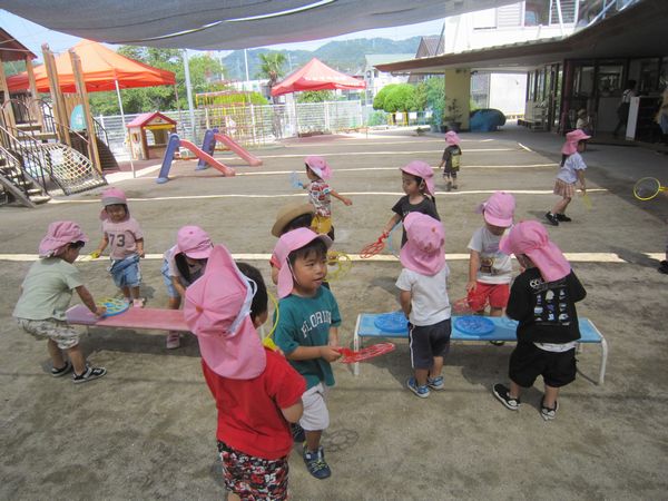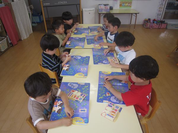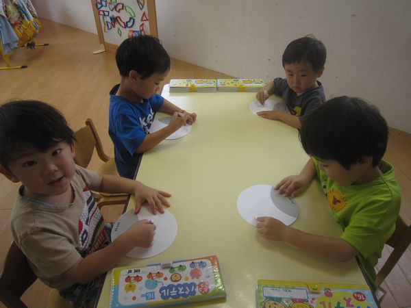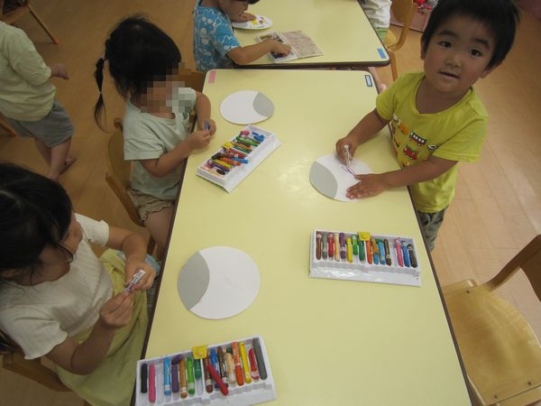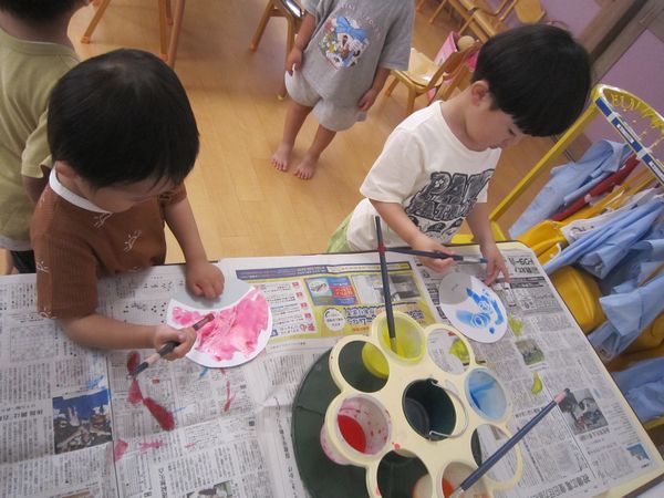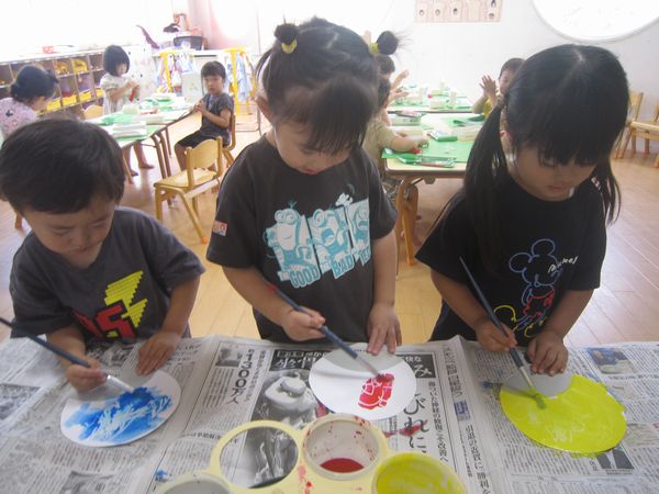 クレパスでいろんな模様を描いて、好きな色の絵の具で色を塗り、はじき絵をしました。絵の具を塗ると、模様が浮かび出て、「わあ!みえた!」と楽しんでいました。自分だけのすてきなうちわができました。暑い時に、みんなで使ってみたいと思います。
