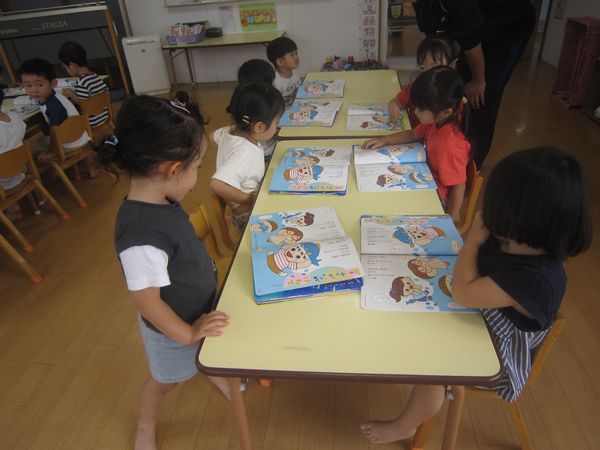 七夕のシール貼りをしたり、ひまわりと手の大きさ比べをしたり、楽しく読みました♪