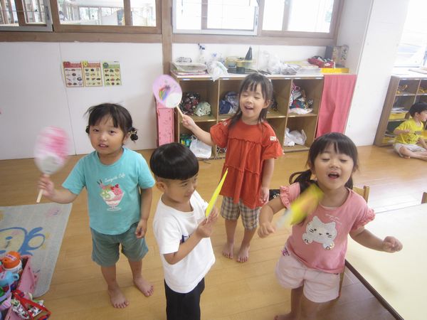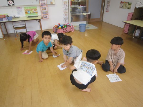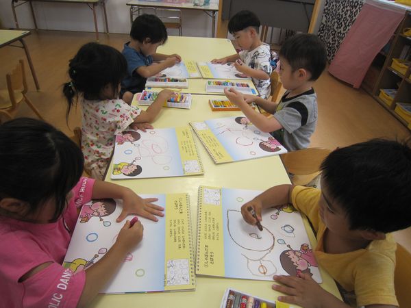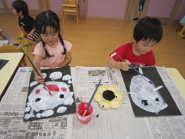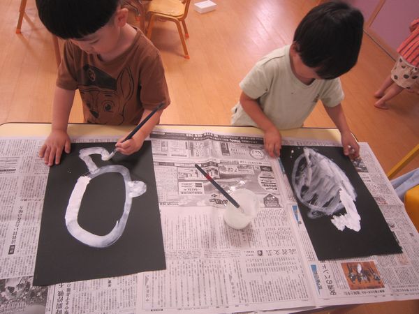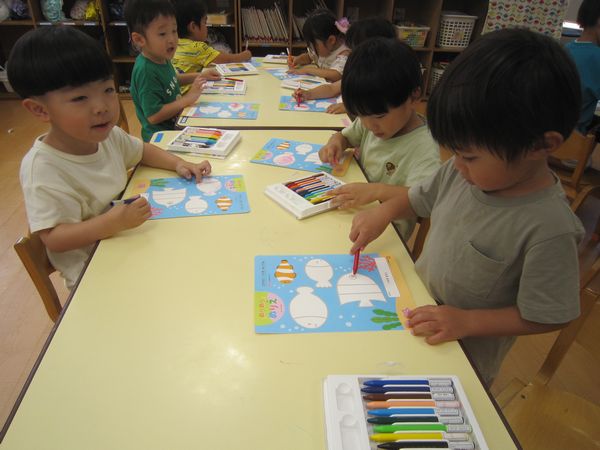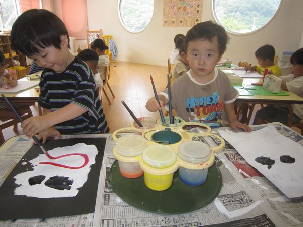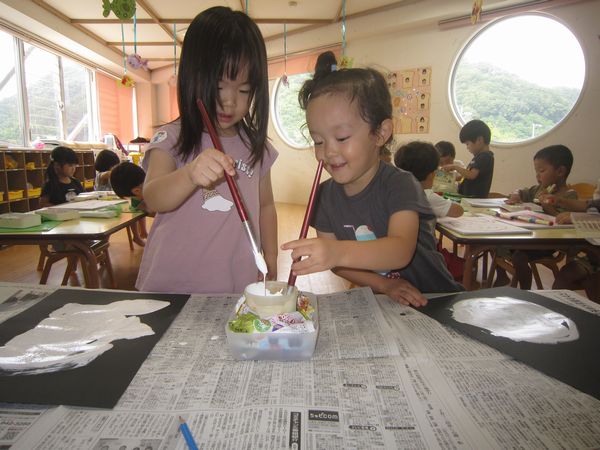 白い画用紙には白色クレパスでお絵描き!あまり見えなかったけど、絵の具で塗るとクレパスの模様が浮かび上がりました!「わあ!すごい!」と、はじき絵を楽しみました♪