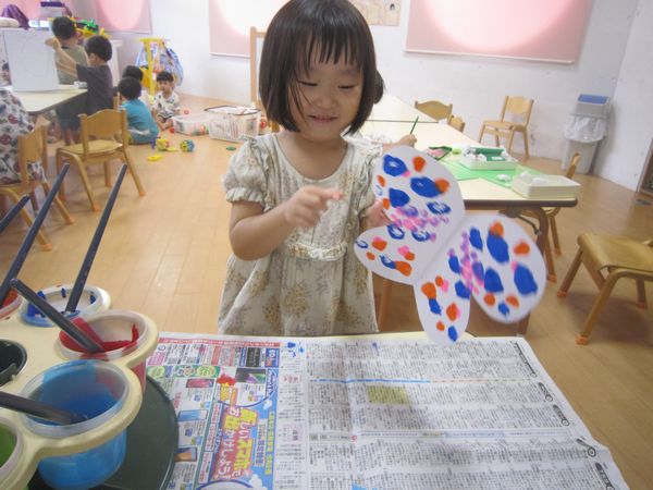 デカルコマニーで作ったちょうちょの羽を、マントにしました。そのマントにシールを貼って、素敵なマントができました。