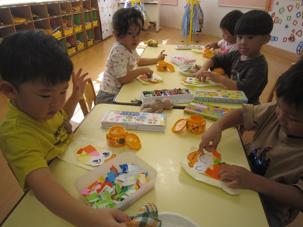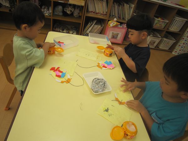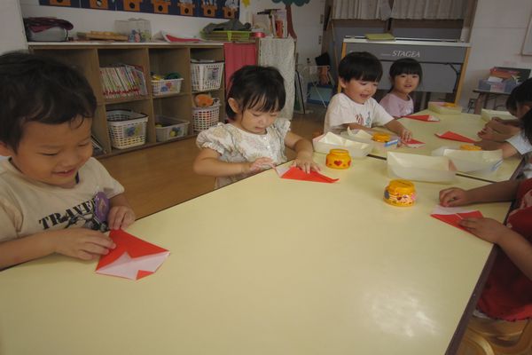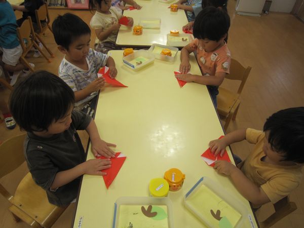 角や線を合わせながら、頑張って折りました。最後にへたとはっぱをつけて、おいしそうなりんごができました!