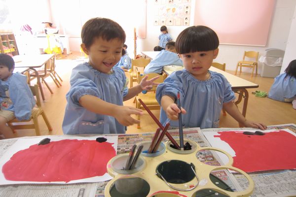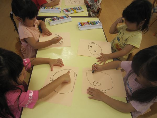 先日実際に見せてもらった消防自動車を思い出しながら、大きな画用紙に絵の具で絵を描いてみました!