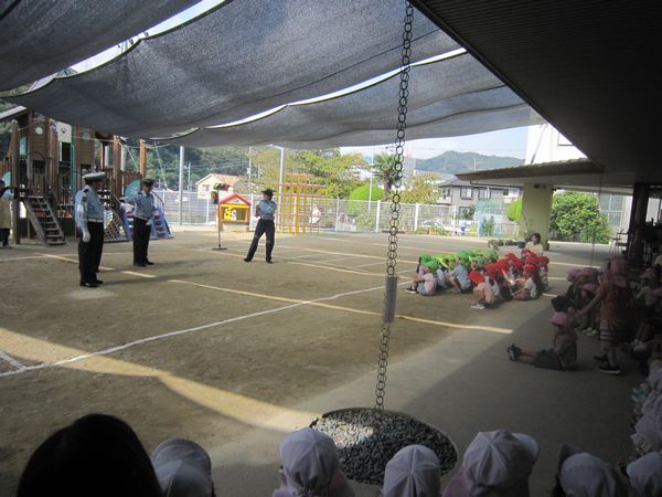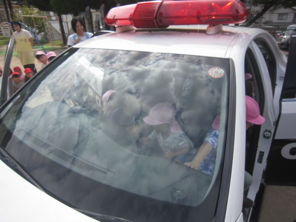 警察署の方と交通推進委員の方が来てくださり、信号機のお話や横断歩道の渡り方を教えていただきました。みんな、しっかりお話を聞いて、上手に横断歩道を渡ることができました。お話を聞いた後、パトカーも見せてもらったり、乗せてもらったりしました。間近で見れて、喜んでいました。