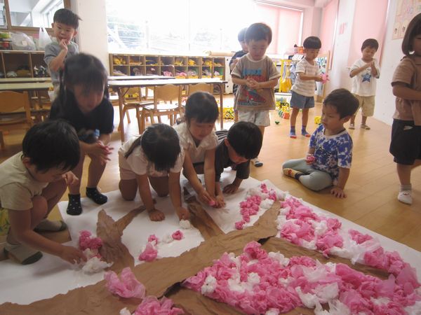 みんなでお花紙を丸めて貼り、大きな桜の木を作りました。作品展で展示するので、楽しみにしていてください!