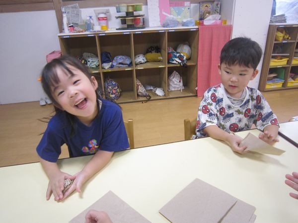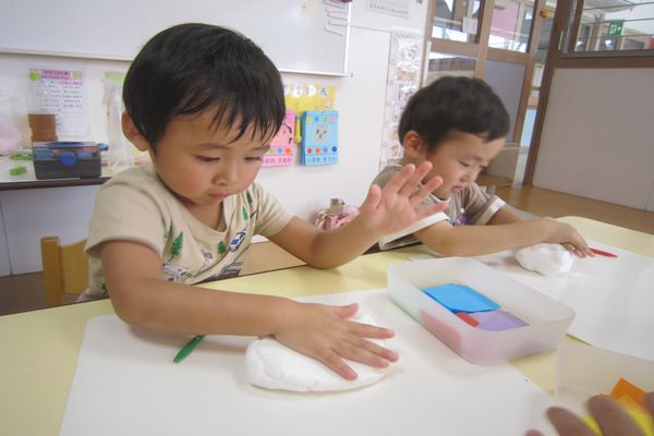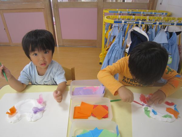 ふわふわの紙粘土をハートやまるなど、好きな形にして、お花紙で飾り付けをし、素敵なお花ができました。「わあ!やわらかい!」「いいにおいがする!」と、いつもとは違う粘土で、楽しんでいました。