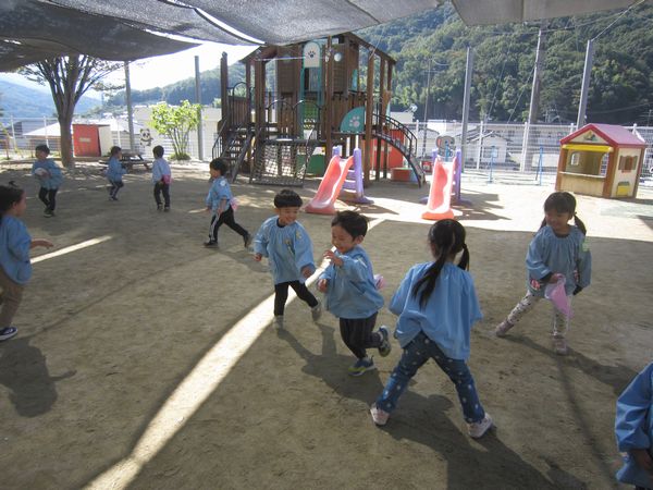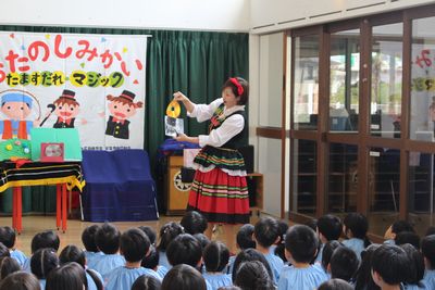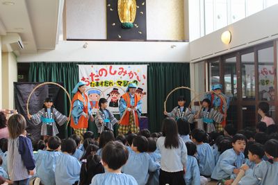 南京玉すだれとマジックを見せてもらいました。玉すだれは初めて見たお友達がほとんどで、「わあ~!」「すごい!」と驚きながら見ていました。マジックも不思議なことがいっぱいで、とても楽しい時間でした。