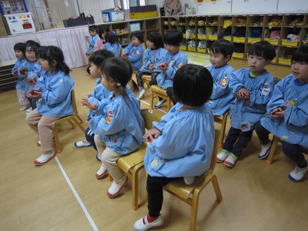 リズムに合わせてカスタネットをたたきました