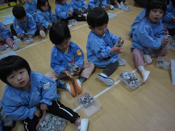 2月3日の節分に向けて、新聞紙の豆を作りました!