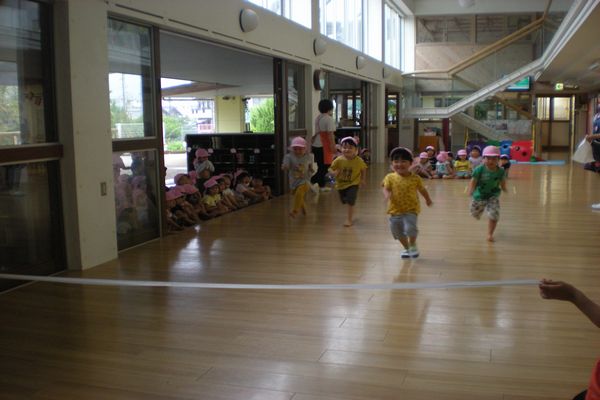 今日はお外は雨でした。昨日に引き続き、雨の場合を想定して、ホールでかけっこの練習をしました。
