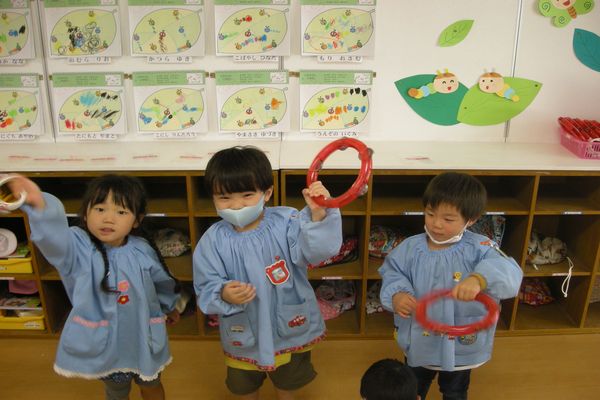 今日は、タンブリンやすずを使っていろいろなリズムをたたいてみました。シャラシャラしてきれいなおと~♪ととっても喜んでいました。大好きな歌にあわせて楽器をたたくと、「たのしいね!」と、自然と笑顔になっていました。