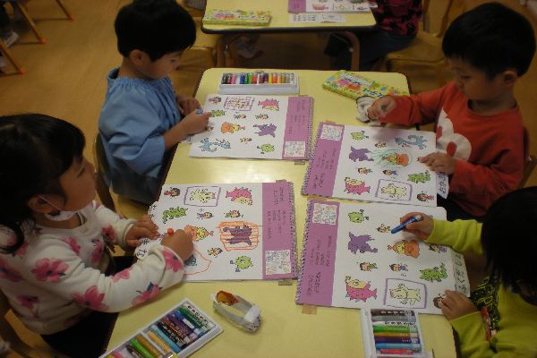 今日予定していた芋のつる切りは、雨のため明日に延期になったので、クレヨン遊びをしました。「かいじゅうどうぶつえん」から逃げ出したかいじゅうたちを、檻を描いて捕まえました。四角や丸、三角などいろんな形の檻を描いて、逃げないようにしっかり格子も描いていました。「あと1ぴきだ!」「全部捕まえたよ!」と楽しそうに描いていました。