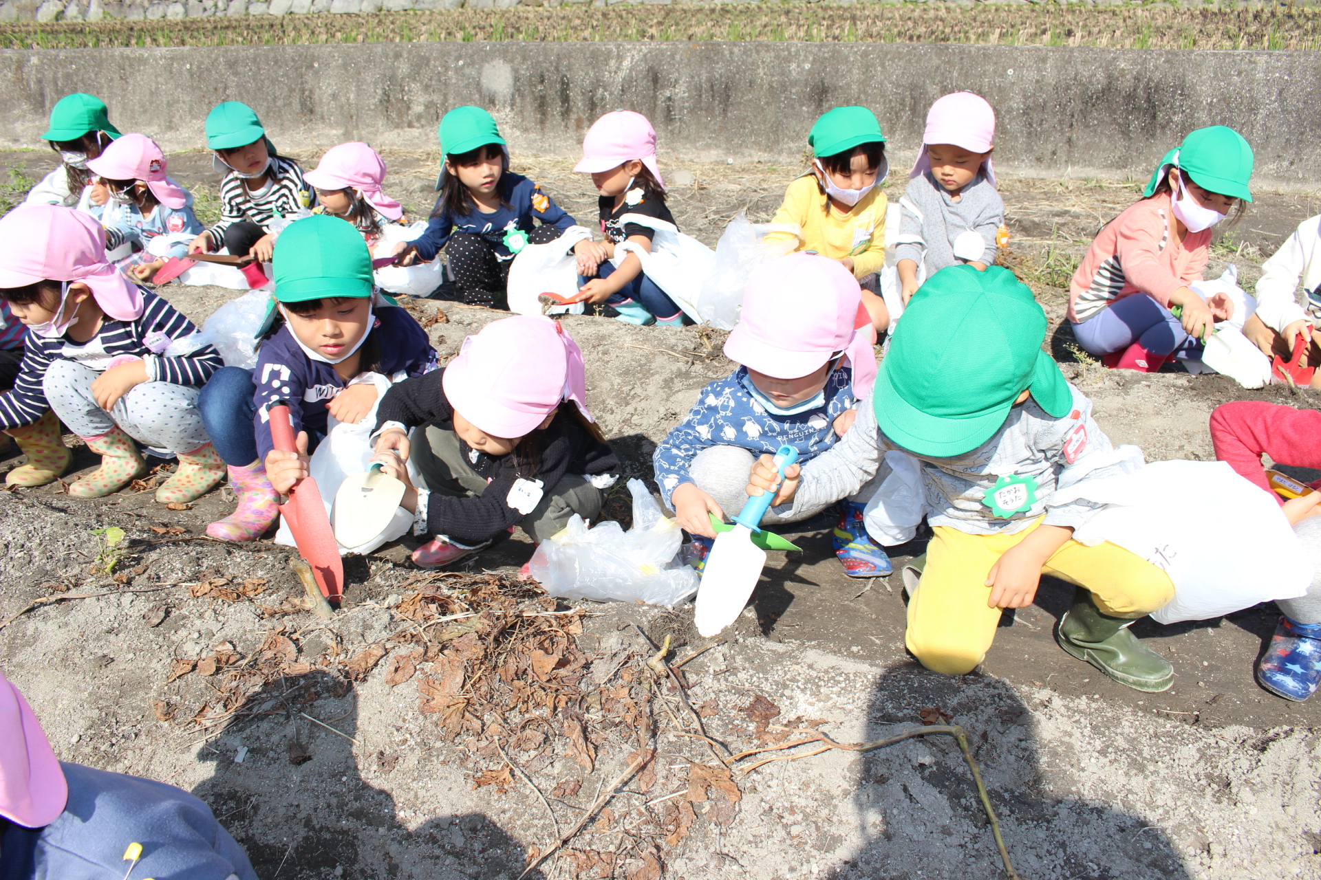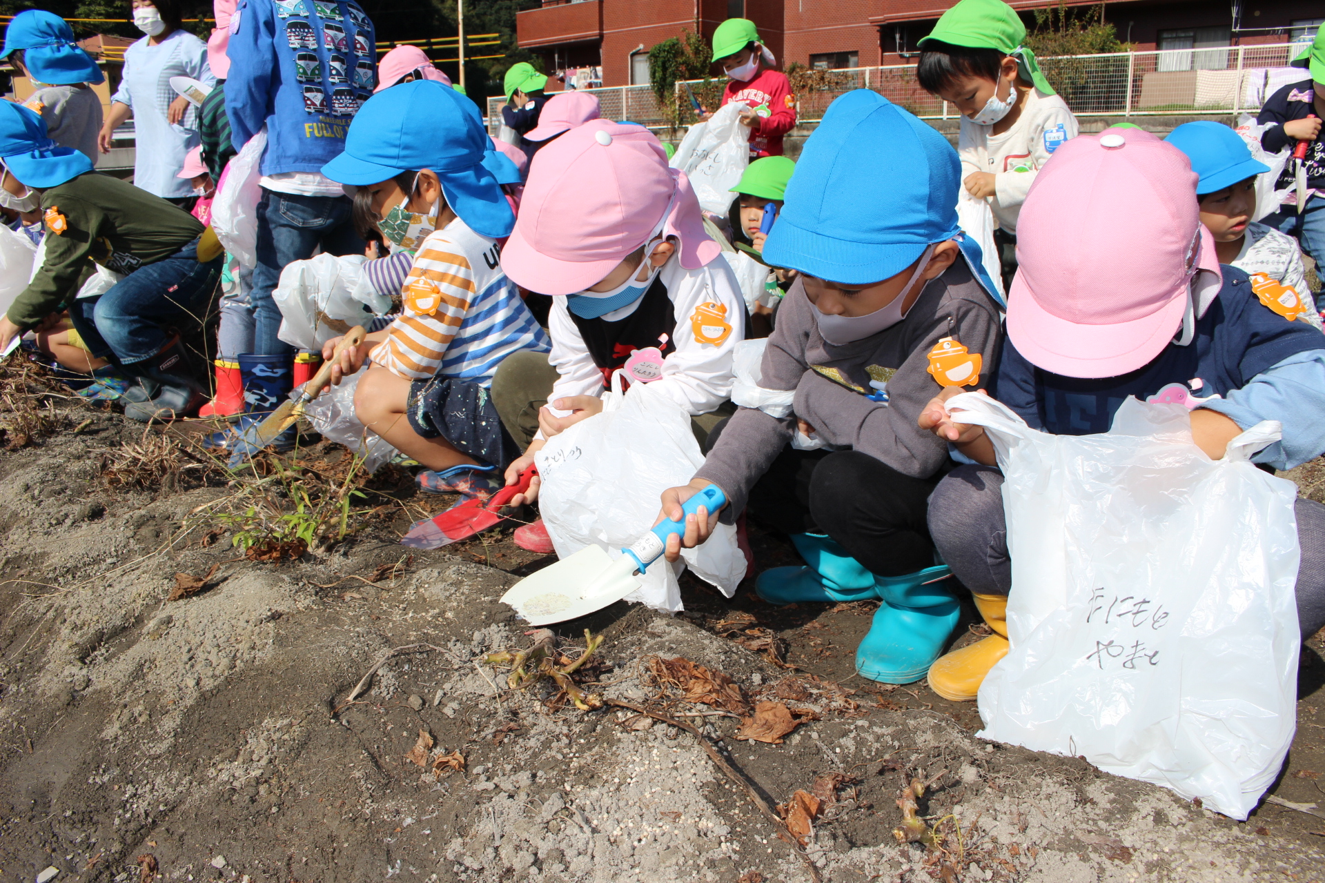 縦割りクラスのお兄ちゃん・お姉ちゃんたちに手伝ってもらいながら、一緒に掘りました。大きなお芋、長いお芋、いろんな形のお芋が出てきて、大喜びでした。「まだありそう!」「先生、今度はどこ掘ったらいい?」とはりきっていました。好きなお芋を選んで持ち帰っています。どんなお料理にしてもらって食べるのかな?またお話が聞けることを、楽しみにしています♪