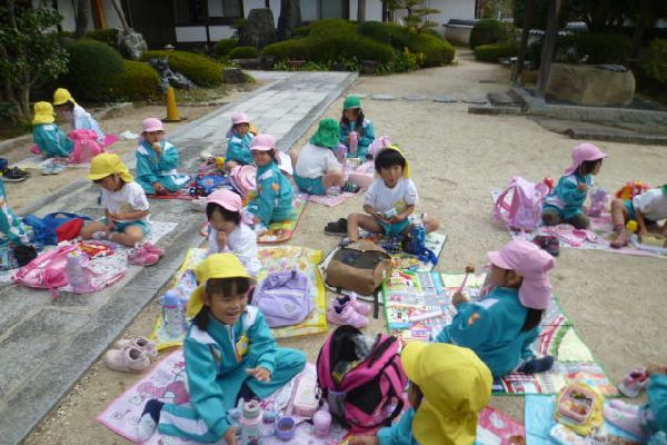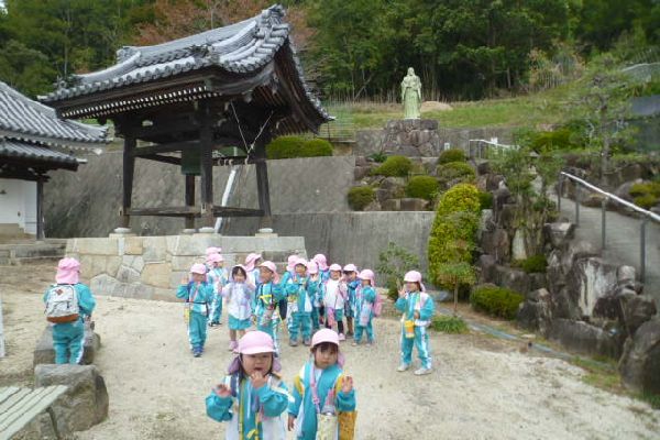 今日は、ミニ遠足でした!たてわりクラスのおにいちゃん、おねえちゃんと一緒におさんぽにしゅっぱーつ!!お寺につくと、みんなで写真をとりました!そのあと、お寺と公園に分かれておべんとうを食べました!たのしかったね!