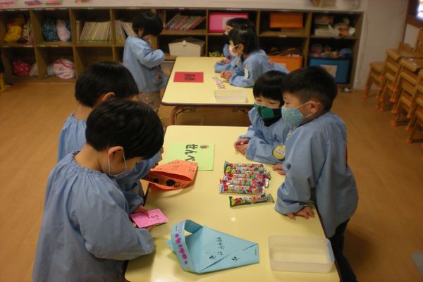 買ったお菓子の中から1つだけ園で食べて、残りのお菓子は持ち帰っています。お家でお話しを聞いてあげてください。