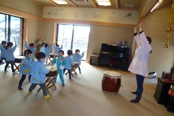果物の名前を叩いたり、「大雨~・小さい雨~」の掛け声に合わせて、ドロドロ~と叩いたり、太鼓の音や響きを楽しみながら取り組みました。「またやりたい!」と言っていました。