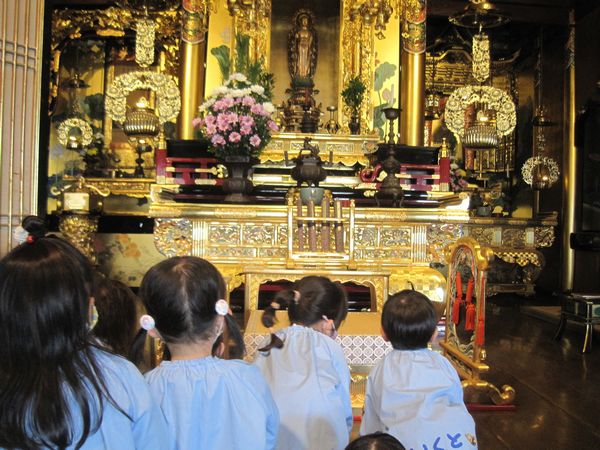 今日は初めてお寺へ行きました。年長組のお兄さん、お姉さんに手を繋いでもらって