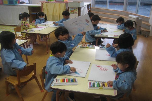 今日はその中から、クレパスを使って自由画帳にお絵描きをしました♪