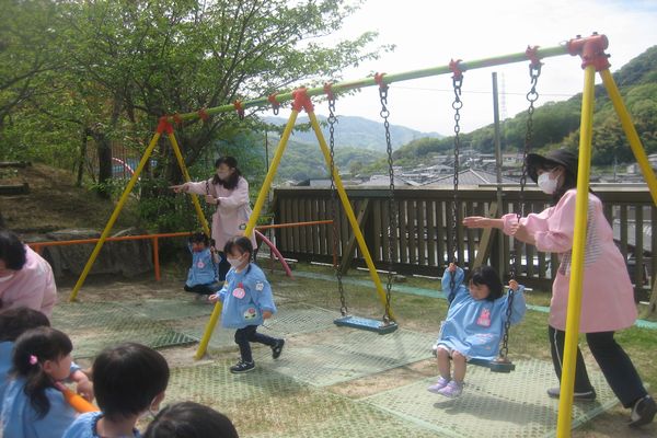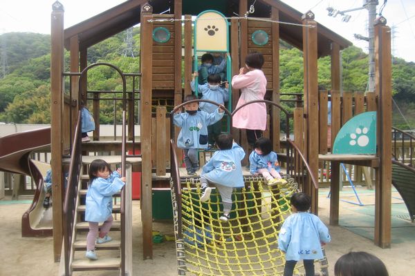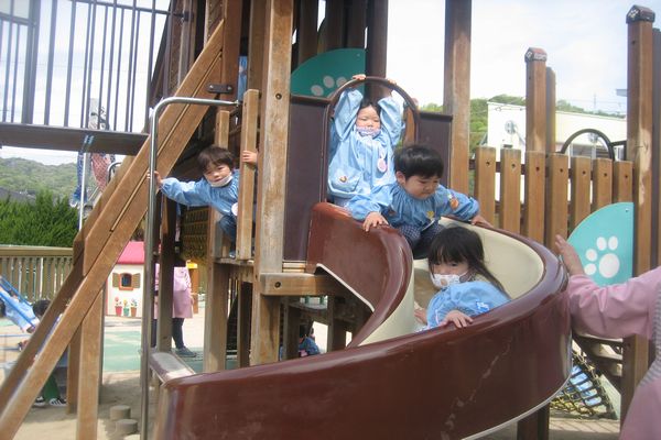今日は幼稚園の外にはどんな楽しい遊具があるのか、みんなで探検してみました! 遊ぶ時のお約束も確認し、たくさんお外で遊びました!