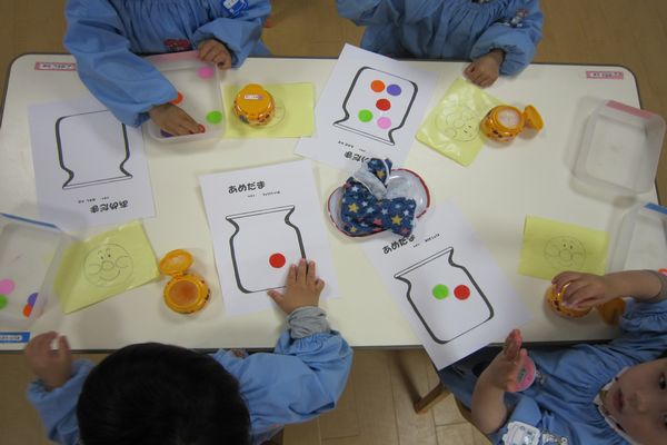 今日は、5つの味のあめ玉をのりで瓶に貼り付けました。