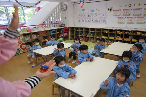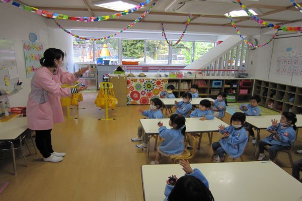 いちご、メロンなどの3つの言葉のリズムに合わせてたたきました!