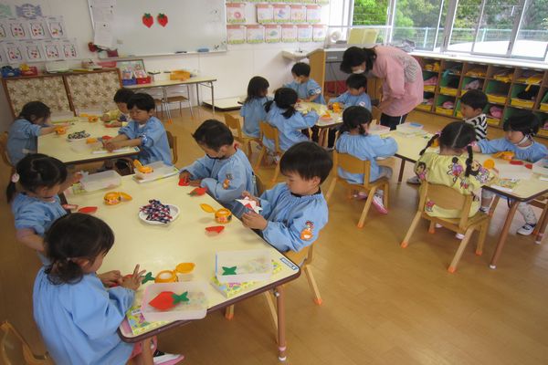 四角の形が段々とイチゴの形に変身していく姿に子ども達も「お~!」と、喜んでいました。