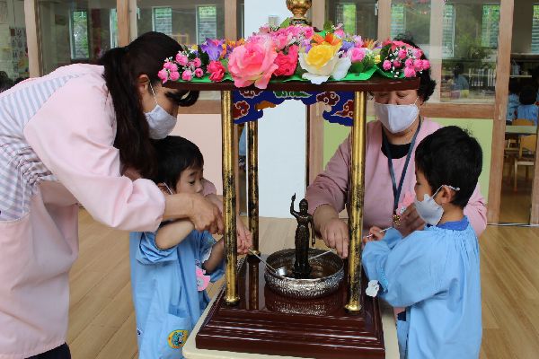 甘茶をかけてみんなでお釈迦様のお誕生をお祝いします。