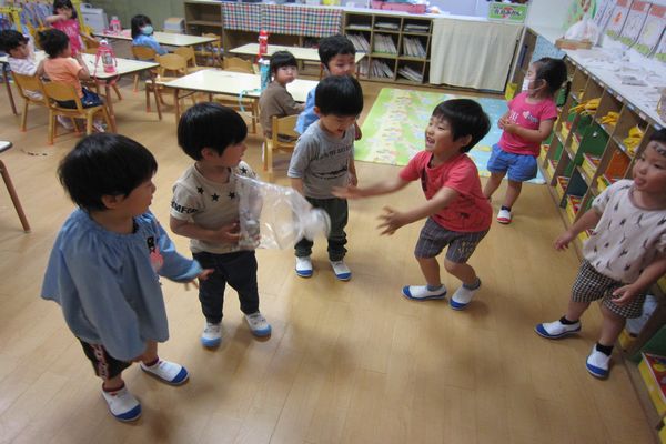 今日は、みんなでハサミを使ってみました。持ち方を、確認しながら、「ぱーぐーぱーぐー」と、切る練習をしました。長い広告を、切ってみました。はじめは、ぎこちなかったお友だちも少しずつ上手になりました。切った広告は、袋にいれてボールにしました。みんなで、遊んでみました。たのしかったね!