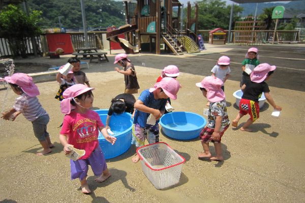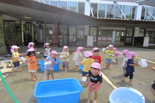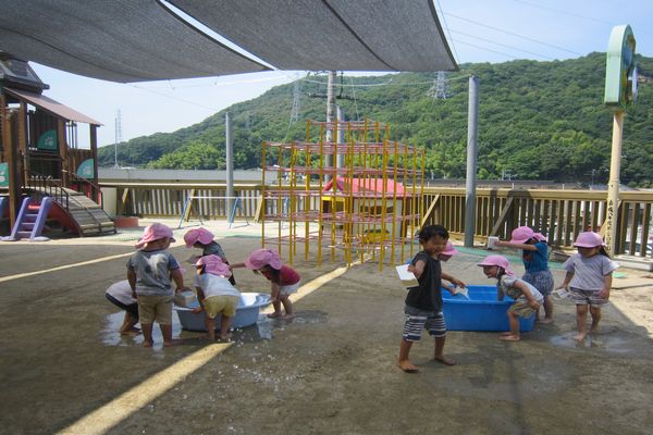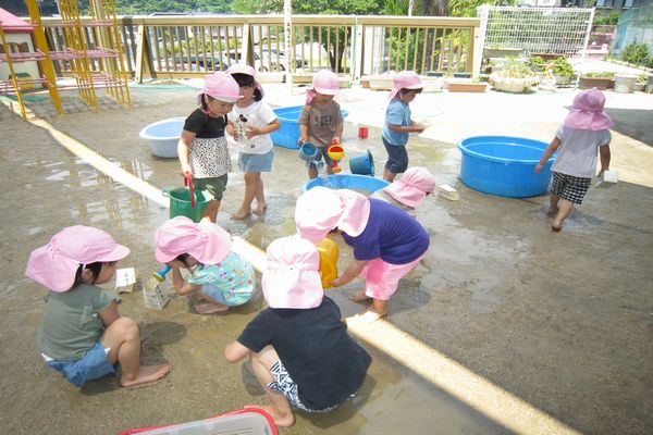 先週雨でできなかったみずあそび!今日は、とってもいい天気で、水遊びにはもってこいの日になりました!クラスごとに、みずあそびをたのしみましたよ!