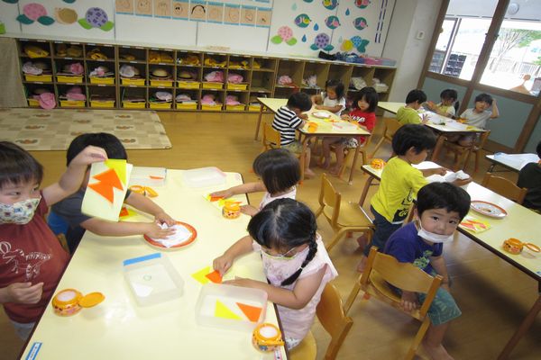 黄色・オレンジ・黄色・オレンジと順番にさんかくをつなげて