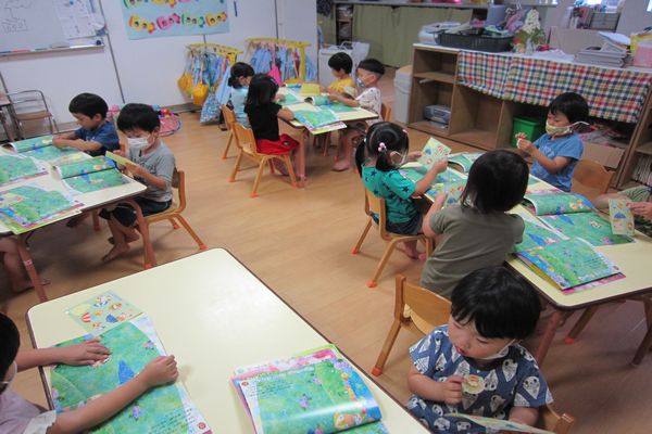 今日は、みんなで6月号の月刊絵本を読みました!梅雨の時期によくみられるかわいいカエルのお話を見たり、歌ったり、シールを貼ったり、楽しいことがいっぱいでした!ページをめくるのも、とっても上手になってきました!