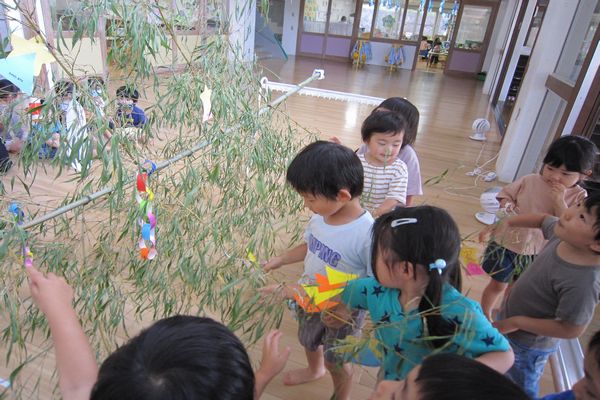 七夕の笹に、みんなで作った飾りをつけました。願い事がかないますように!