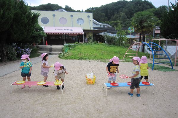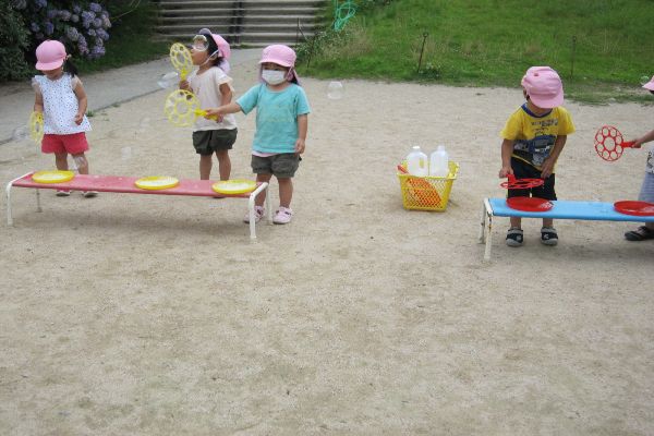 昨日と今日で、シャボン玉遊びをしました。大きなしゃぼん玉をつくるセットを準備してもらって、みんなでチャレンジ!「わーっきれい♪」「いっぱいできた~」と、大喜びでした!