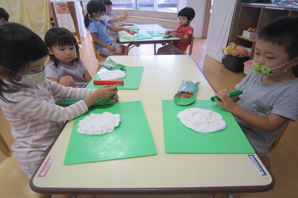 紙粘土の感触が気持ちよかったようで、「ふわふわだね~♡」といいながら、みんなで楽しく作りました!
