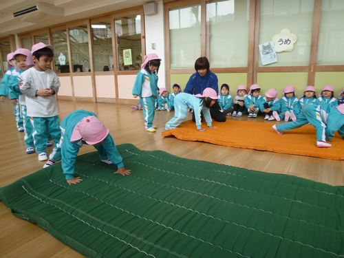 今日は、初めての体操教室でした。みんなで、準備体操をしたあと、マットの上でいろいろな動物になってうごいてみました。くまさん、うさぎさん、わにさんになって、上手に動けました。最後は楽しいゲームをしました。次回が楽しみです。