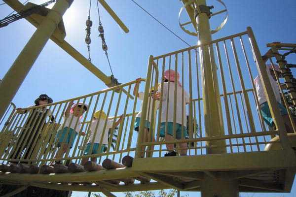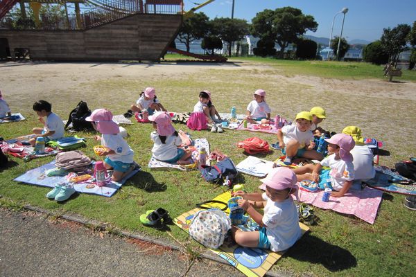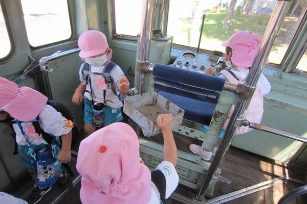 園外保育1日目は、うめ組さんと一緒にうさぎ組、ことり組でバスに乗っていってきました。行き先は、呉ポートピアパークです。広い公園で、みんな大喜び!!大きな船の遊具で遊んだり、路面電車の中に入ってみました!
