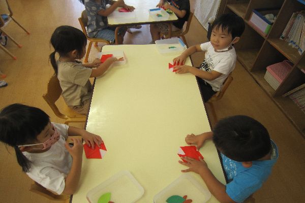 今日は折り紙でりんごを作りました! 折り紙の角と角を合わせて折っていきます。 上手に出来ました☆