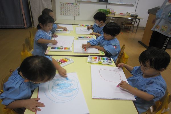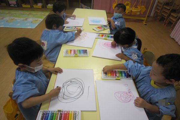 今日はみんなでお絵かきをしました。 どんな色~が好き? 「あか!リンゴかくよ~」 「にじ!いっぱいの色」 「タイヤ!ぐるぐる♪」 といろんな色を使って楽しんでいました。