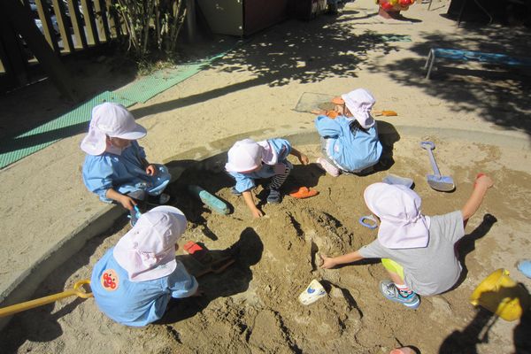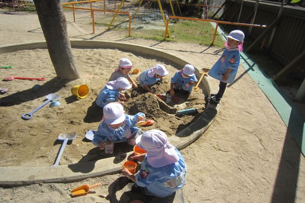 朝は寒さを感じましたが、日中はとってもいいお天気でした。 みんなでお山を作りました。トンネルにお水を流して船を浮かべたり 泥団子を作ったりしてたくさん遊びました♪