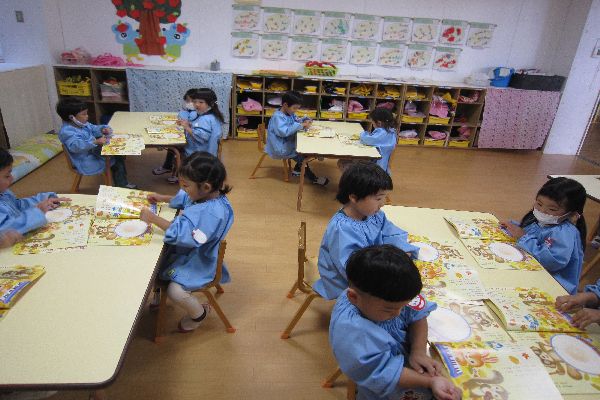 今日から11月!みんなで、11月号の絵本を見ました。秋の自然に触れるページも多く、どんぐりのページを喜んでいました!お店屋さんのシール貼りも楽しみました!よかったね!