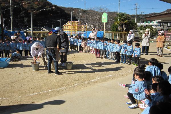 12月生まれの誕生会がありました。おもちつきも行われ、みんなでおもちつきをみました。