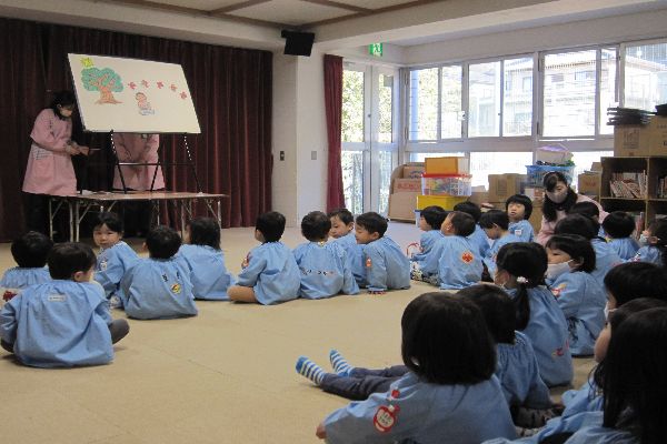 成道会のお祝いもしました。パネルシアターを見せてもらって、副園長先生からお話をしていただきました。成道会は、お釈迦様がお悟りをひらかれた日です。クラスに帰って、おいしいロールケーキも頂きました。