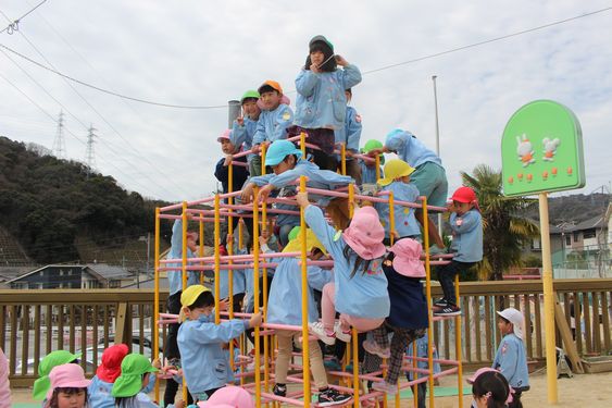 年少さんも手に力を入れて、頑張って上まで登るお友達もいました。上るだけでなく、くぐったり、横歩きしたり、いろいろな遊びが楽しめそうです。