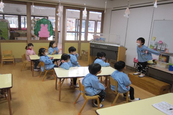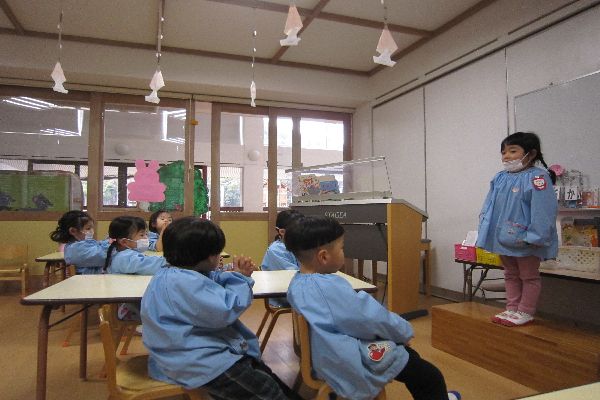 2月の参観日で、好きな遊びを発表する予定です。台にあがって、一人ずつ発表します。ドキドキする子もいますが、みんな頑張っています!
