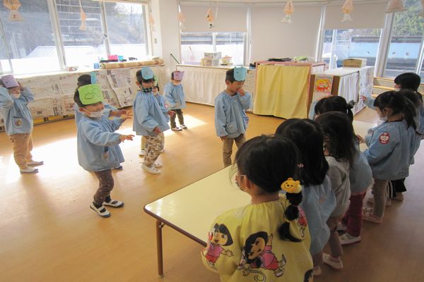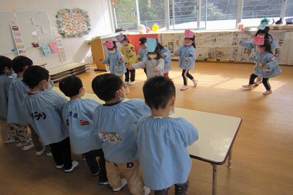 今年はこわい鬼は来ませんでしたが、自分で作った鬼のお面を被って順番に鬼に変身し合い、「おには~そと」「ふくわ~うち」と、豆まきをしました!