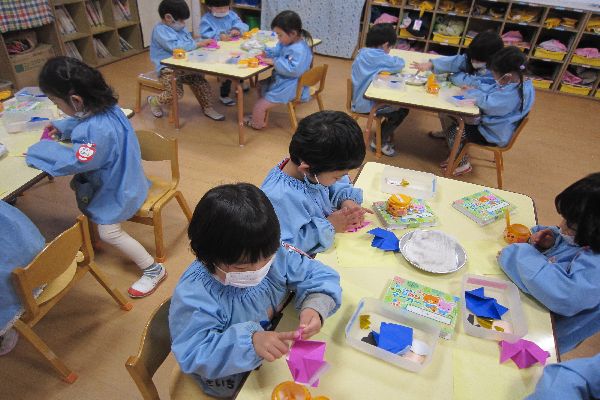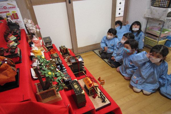 幼稚園の事務所に、雛飾りが飾られました。みんなで、見に行ってみました。「わあ!きれい!」「すてきだね!」と、みんな大喜びでした!そのあと、部屋に帰って、みんなでおひなさまをつくりました。とってもかわいいおひなさまが出来上がりました!