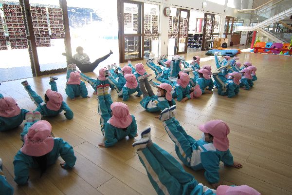 体操の先生と一緒に準備体操をして足をピンと伸ばしたり開いたりバランスを取りました。