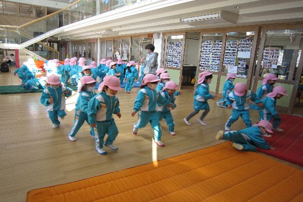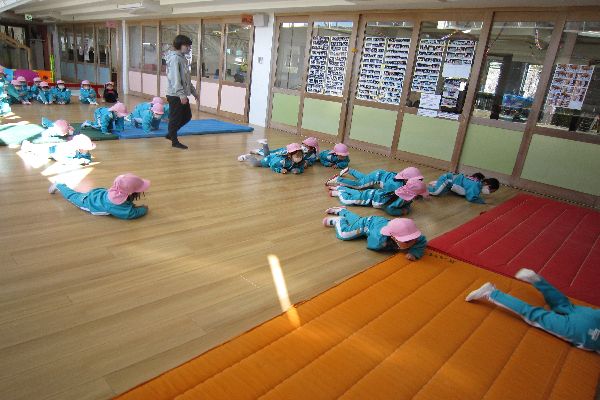 みんなで動物に変身してくまさんやカエルさんワニさんになって動物歩き。