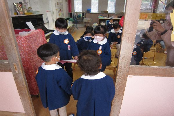 19日に幼稚園を卒園するほし組さん!1年間、年少組さんの着替えのお手伝いや、部屋のおそうじ、そしてお出かけするときには手をつないでくれたりと、たくさん優しくしてくれました。だいすきなほし組さんに、おてがみをかきました。今日は、みんなで届けに行きました!